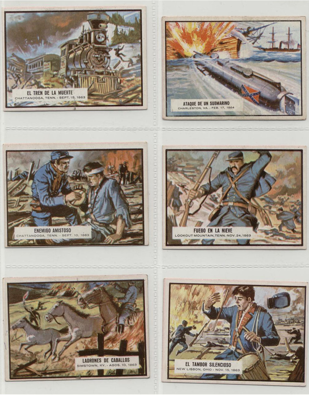 "I can finally confirm that they exist and everything you say is true. I have acquired 65 out of the 88 from a collector in Italy." "They were printed and issued in Spain in 1968. They pretty much follow the same storylines as the US and UK editions (as far as I can tell, not speaking Spanish). However while some fronts are exactly the same, most - including all the bloody ones - have been completely redrawn." "It is fascinating to compare the fronts of the Spanish set and the standard set. There is a huge contrast. Not only have they dropped the bloodier cards, but the pictures also reflect very definite cultural and stylistic differences. The pictures are differently composed and the characters look different. It is worth bearing in mind that, although the subject matter is American, they were produced in Spain at the height of the spaghetti westerns, which commonly had a Civil War element." |